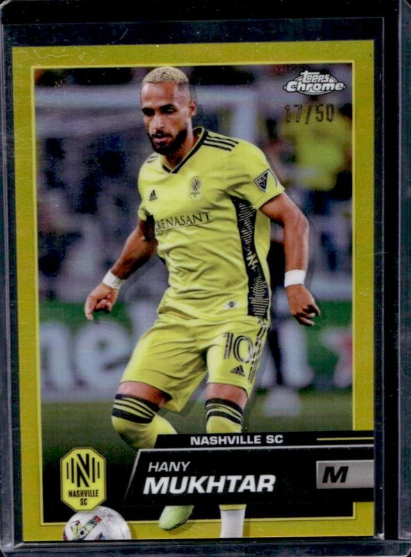 The Hany Mukhtar 2023 Topps Chrome MLS #42 Gold Refractor /50 card is 1 of 28 Hany Mukhtar's card variations in the 2023 Topps Chrome MLS set being tracked by Sports Card Investor, including #42 Base, #42b Base, #42 Pink X-Fractor, #42 Refractor, and #42 Speckle Refractor.