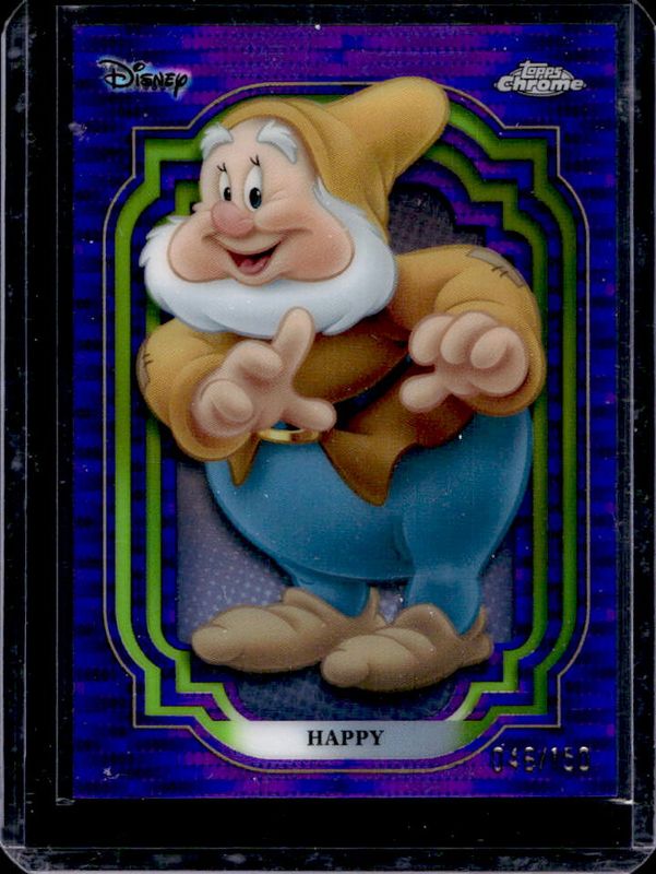 The Happy 2024 Topps Chrome Disney #13 Purple & Green Pulsar /150 card is 1 of 15 Happy's card variations in the 2024 Topps Chrome Disney set being tracked by Sports Card Investor, including Base, Refractor, Purple Refractor /199, Black & White Speckle /101, and Green Refractor /99.