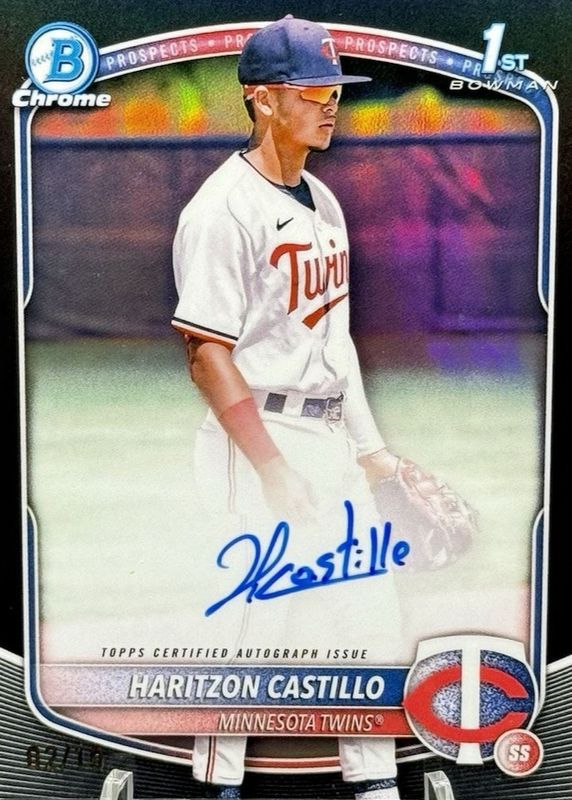 This card is 1 of 87 Haritzon Castillo's card variations in the 2025 Bowman Chrome set being tracked by Sports Card Investor, including International Refractor Variation, Prospect Auto (1st), Prospect Auto - Black & White Shimmer Refractor (1st), Prospects (1st), and Prospects - Mini-Diamond Refractor (1st).