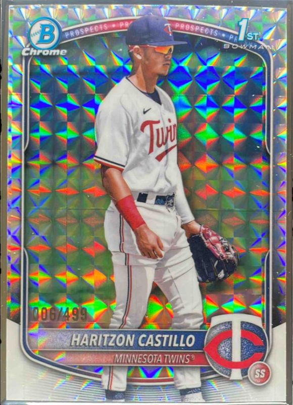 This card is 1 of 87 Haritzon Castillo's card variations in the 2025 Bowman Chrome set being tracked by Sports Card Investor, including International Refractor Variation, Prospect Auto (1st), Prospect Auto - Black & White Shimmer Refractor (1st), Prospects (1st), and Prospects - Mini-Diamond Refractor (1st).