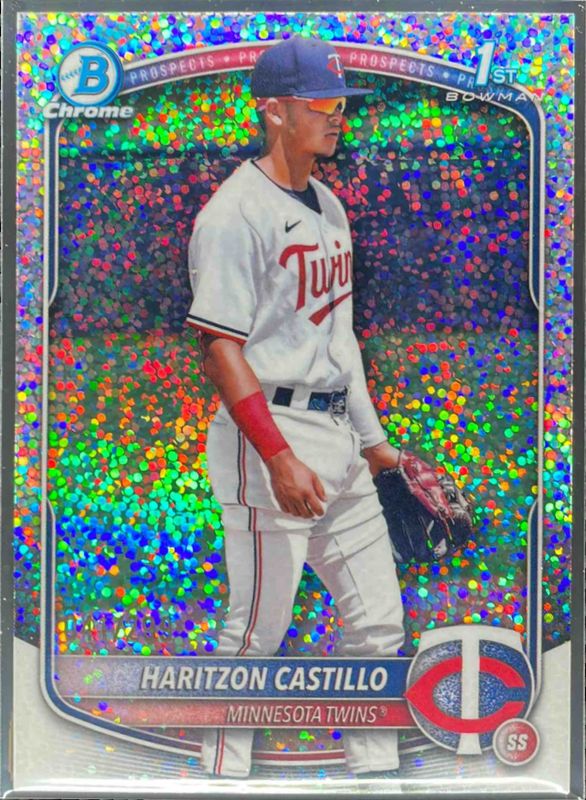 This card is 1 of 87 Haritzon Castillo's card variations in the 2025 Bowman Chrome set being tracked by Sports Card Investor, including International Refractor Variation, Prospect Auto (1st), Prospect Auto - Black & White Shimmer Refractor (1st), Prospects (1st), and Prospects - Mini-Diamond Refractor (1st).