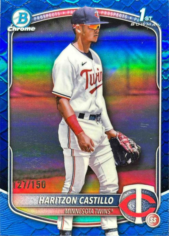 This card is 1 of 87 Haritzon Castillo's card variations in the 2025 Bowman Chrome set being tracked by Sports Card Investor, including International Refractor Variation, Prospect Auto (1st), Prospect Auto - Black & White Shimmer Refractor (1st), Prospects (1st), and Prospects - Mini-Diamond Refractor (1st).