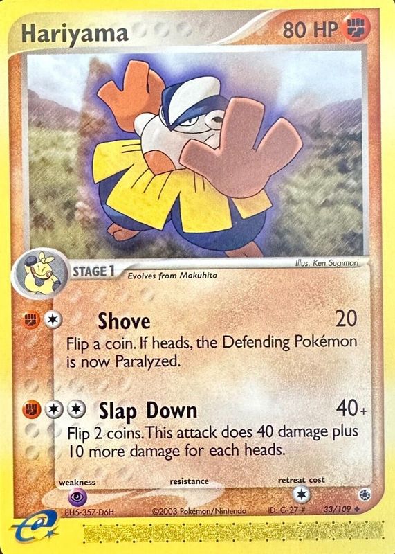 This card is 1 of 4 Hariyama's card variations in the 2003 EX: Ruby & Sapphire set being tracked by Sports Card Investor, including #008/109 Holo, #008/109 Reverse Holo, and #033/109 Reverse Holo.