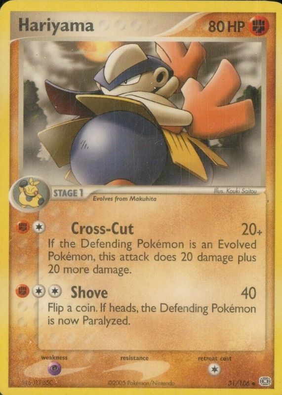 The Hariyama 2005 EX: Emerald #031/106 Base card in Raw TCG (Near Mint) condition has not changed in price in the last 30 days and was last sold for $1.99 .