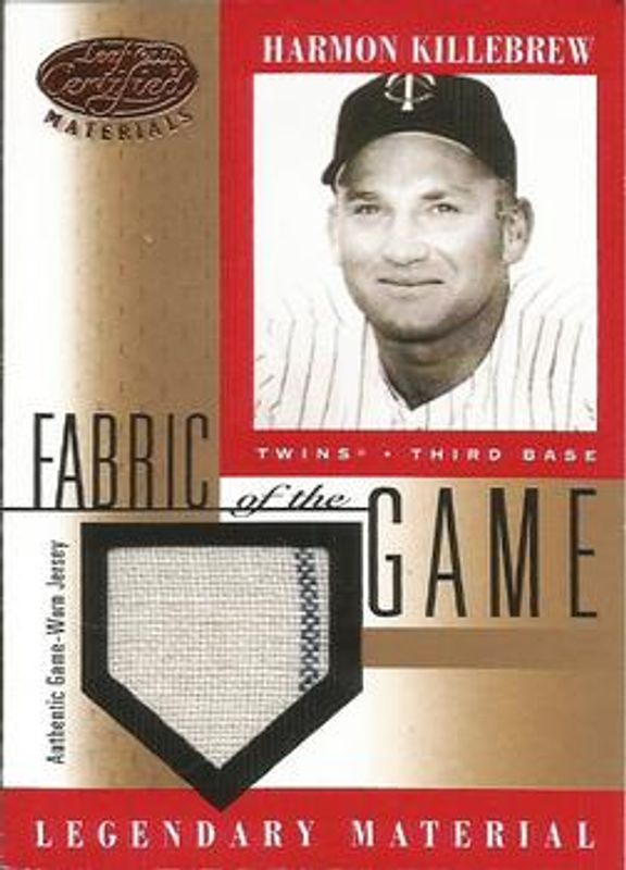The Harmon Killebrew 2001 Leaf Certified Materials #FG-15 Fabric of the Game card is 1 of 5 Harmon Killebrew's card variations in the 2001 Leaf Certified Materials set being tracked by Sports Card Investor, including Fabric of the Game - Career /92, Fabric of the Game - Jersey Number /45, Fabric of the Game - Season /24, and Fabric of the Game - Century /21.