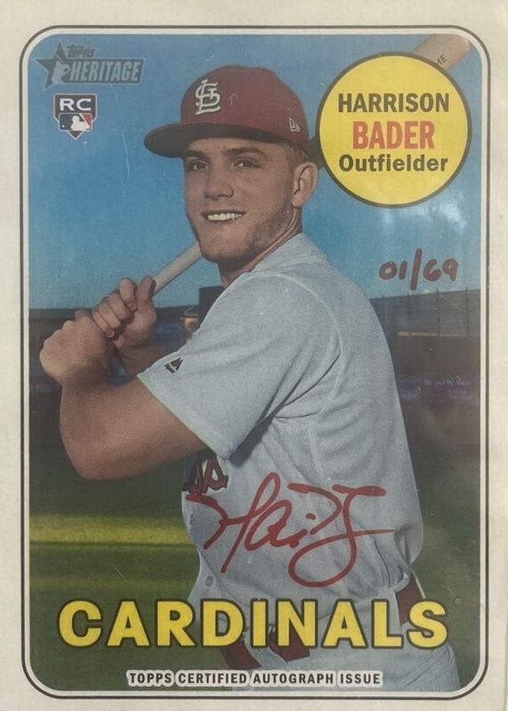 The Harrison Bader 2018 Topps Heritage #ROA-HB Real One Autographs - Red Ink /69 Rookie card in Raw condition has not changed in price in the last 30 days and was last sold for $39.99 .
