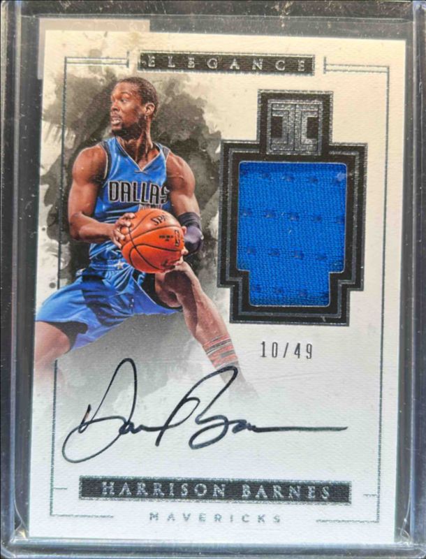 The Harrison Barnes 2016 Impeccable #EV-HB Elegance Veteran Jersey Autographs - Silver /49 card is 1 of 10 Harrison Barnes' card variations in the 2016 Impeccable set being tracked by Sports Card Investor, including Base /99, Holo Silver /25, Holo Gold /10, Platinum /1, and Elegance Veteran Jersey Autographs /99.