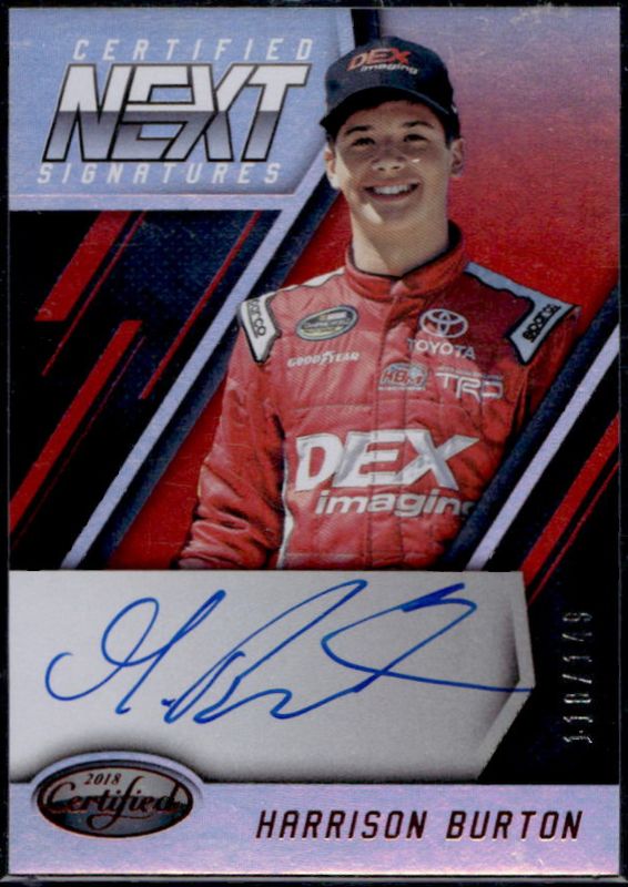 The Harrison Burton 2018 Certified NASCAR #NEXT-HB Certified Next Signatures - Red /149 card is 1 of 7 Harrison Burton's card variations in the 2018 Certified NASCAR set being tracked by Sports Card Investor, including Certified Next Signatures /210, Certified Next Signatures - Blue /50, Certified Next Signatures - Gold /25, Certified Next Signatures - Purple /10, and Certified Next Signatures - Green /5.