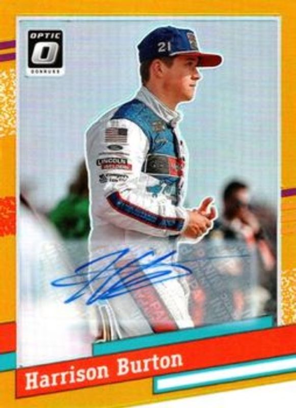 The Harrison Burton 2024 Donruss NASCAR #140 Optic Signatures Gold /10 card is 1 of 96 Harrison Burton's card variations in the 2024 Donruss NASCAR set being tracked by Sports Card Investor, including #140 Base, #67 Base, #140 Optic, #67 Optic, and #67 Optic Black Pandora.