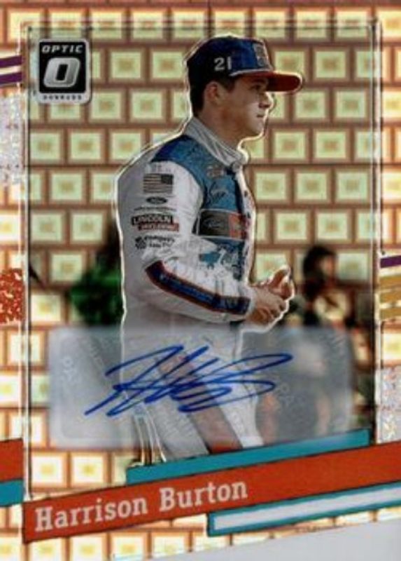 The Harrison Burton 2024 Donruss NASCAR #140 Optic Signatures Pandora /25 card is 1 of 96 Harrison Burton's card variations in the 2024 Donruss NASCAR set being tracked by Sports Card Investor, including #140 Base, #67 Base, #140 Optic, #67 Optic, and #67 Optic Black Pandora.