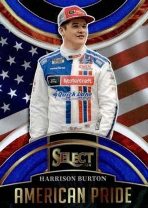 The Harrison Burton 2024 Select NASCAR #27 American Pride Blue /49 card is 1 of 85 Harrison Burton's card variations in the 2024 Select NASCAR set being tracked by Sports Card Investor, including #151 Base, #251 Base, #51 Base, #251 Base Orange Flash, and #151 Base Orange Flash.