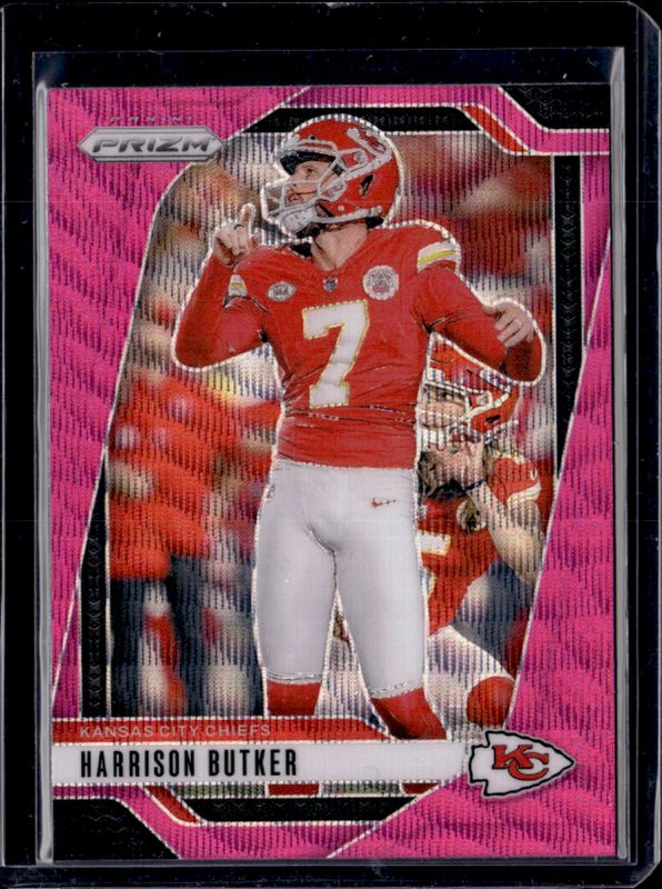 The Harrison Butker 2024 Prizm #144 Pink Wave card is 1 of 83 Harrison Butker's card variations in the 2024 Prizm set being tracked by Sports Card Investor, including Base, Choice Blue Yellow Green, Choice Silver, Disco, and Green.
