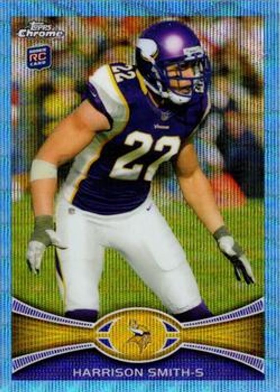 The Harrison Smith 2012 Topps Chrome #BW-77 Blue Wave Refractor Rookie card is 1 of 19 Harrison Smith's card variations in the 2012 Topps Chrome set being tracked by Sports Card Investor, including Base, Orange Refractor, Refractor, X-Fractor, and Camo Refractor /499.