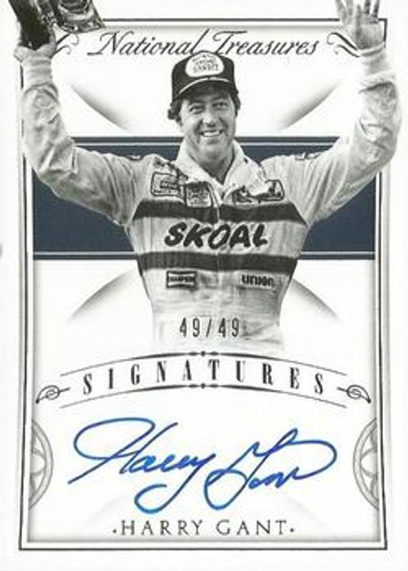 The Harry Gant 2016 National Treasures NASCAR #S-HG Signatures /99 card is 1 of 18 Harry Gant's card variations in the 2016 National Treasures NASCAR set being tracked by Sports Card Investor, including Base /25, Century Silver /20, Century Gold /15, Century Black /5, and Century Blue /1.