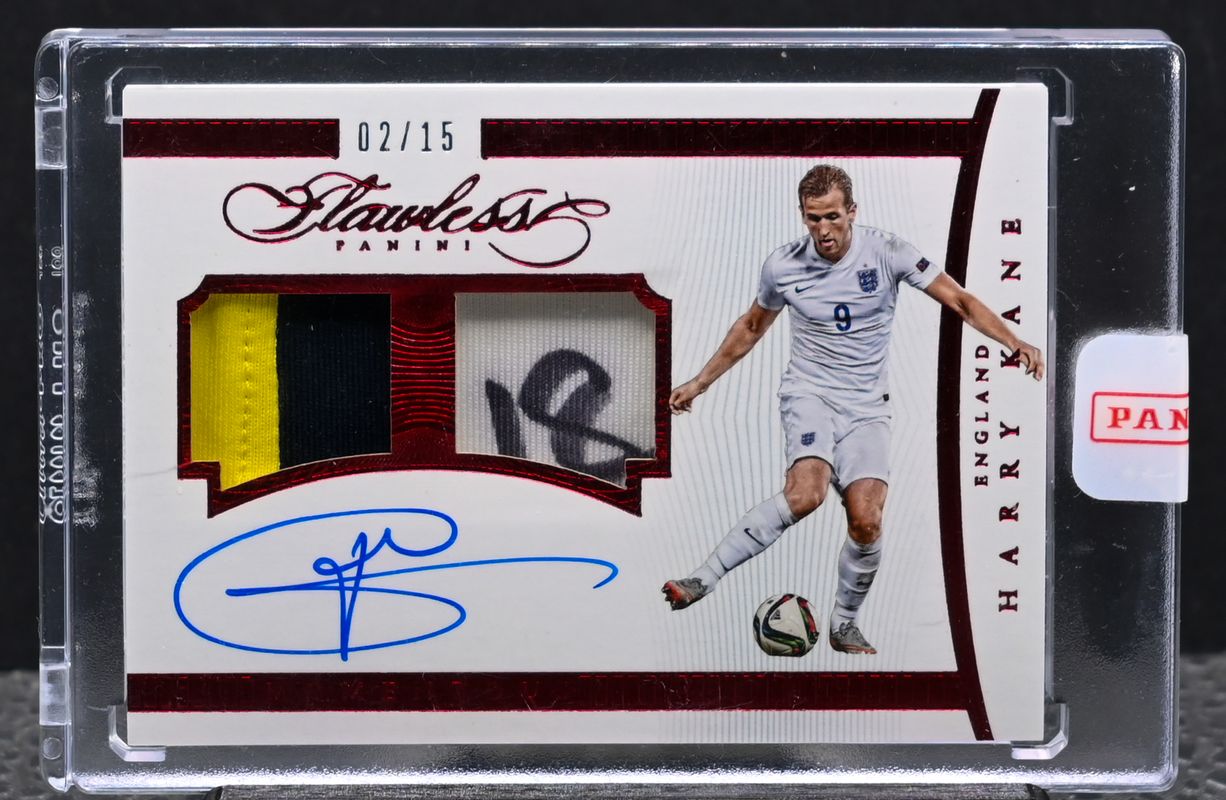 The Harry Kane 2015 Flawless #M-HK Momentous Autographed Memorabilia /25 card is 1 of 72 Harry Kane's card variations in the 2015 Flawless set being tracked by Sports Card Investor, including Flawless Finishes Signatures /25, Flawless Signatures /25, International Icons Signatures /25, Pitch Perfect Signatures /25, and Sole of the Game Signatures /25.