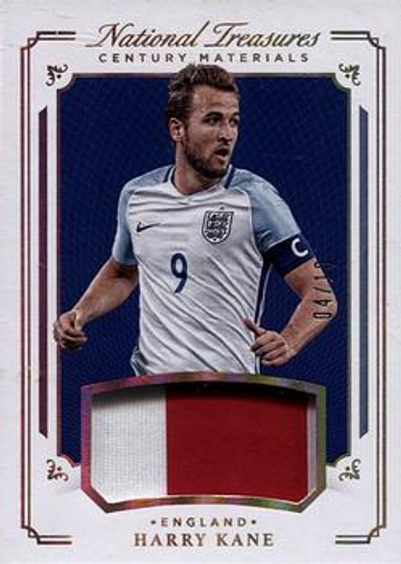 The Harry Kane 2018 National Treasures #CE-HK Century Materials - Gold /10 card is 1 of 58 Harry Kane's card variations in the 2018 National Treasures set being tracked by Sports Card Investor, including Base /50, Bronze /25, Gold /10, Emerald /5, and Platinum /1.