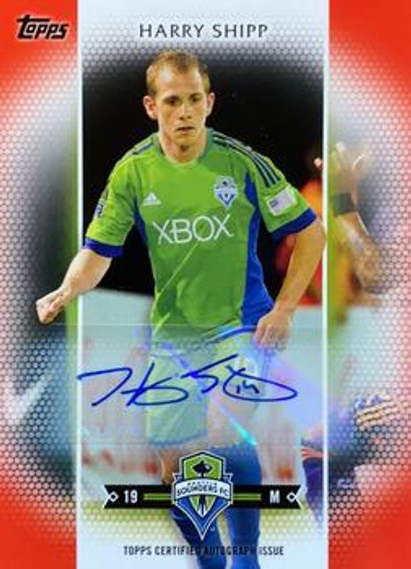 The Harry Shipp 2017 Topps MLS #91 Autographs Red /10 card is 1 of 9 Harry Shipp's card variations in the 2017 Topps MLS set being tracked by Sports Card Investor, including Base, Blue /99, Orange /25, Red /10, and Black /1.
