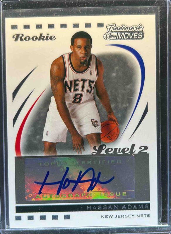 The Hassan Adams 2006 Topps Trademark Moves #123 Base /149 Rookie card is 1 of 5 Hassan Adams' card variations in the 2006 Topps Trademark Moves set being tracked by Sports Card Investor, including Foil /75, Rainbow /35, Wood /19, and Wood Red /10.