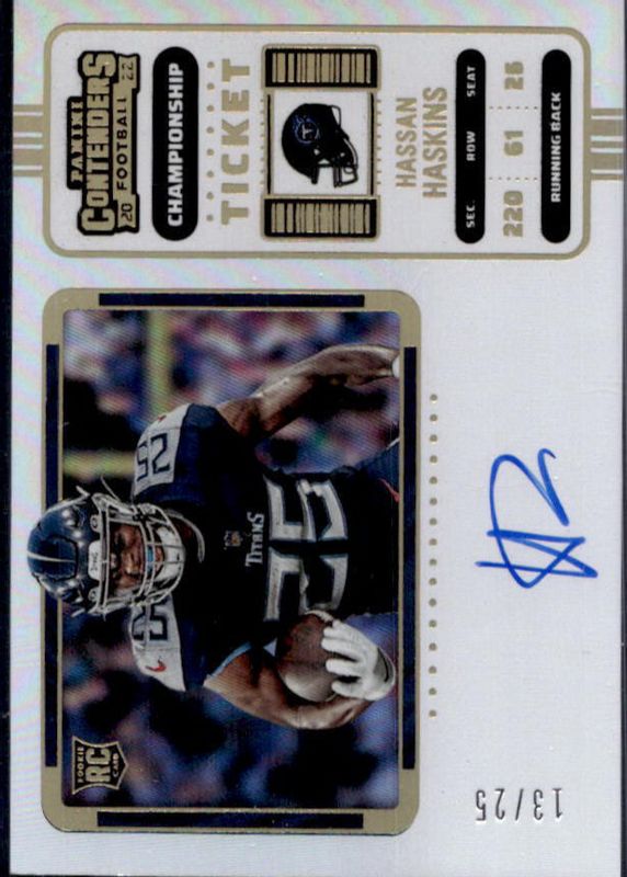 The Hassan Haskins 2022 Contenders #119 Rookie Ticket Auto Variation - Championship Ticket /25 card in Raw condition has not changed in price in the last 30 days and was last sold for $1.25 .
