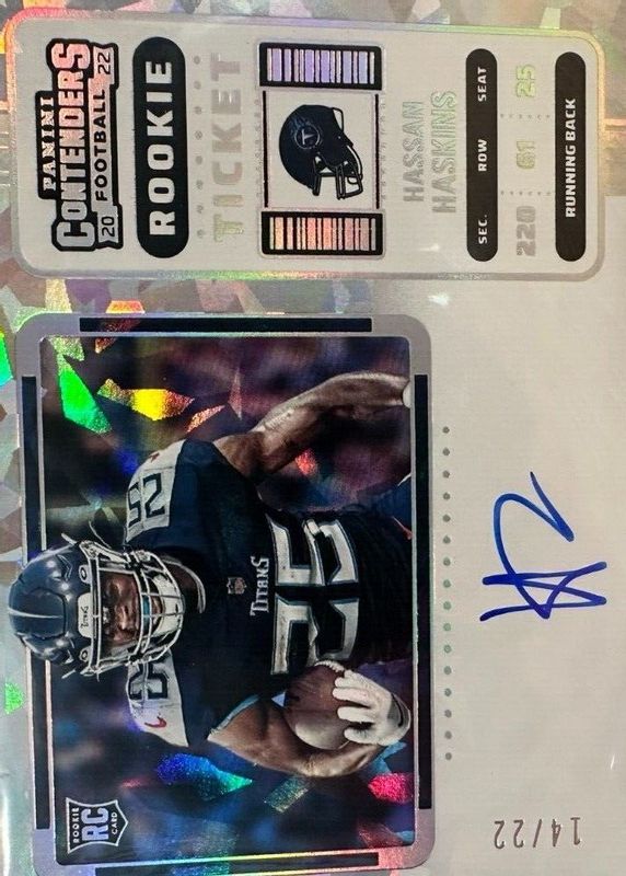 The Hassan Haskins 2022 Contenders #119 Rookie Ticket Auto Variation - Cracked Ice Ticket /22 card in Raw condition has not changed in price in the last 30 days and was last sold for $36.00 .