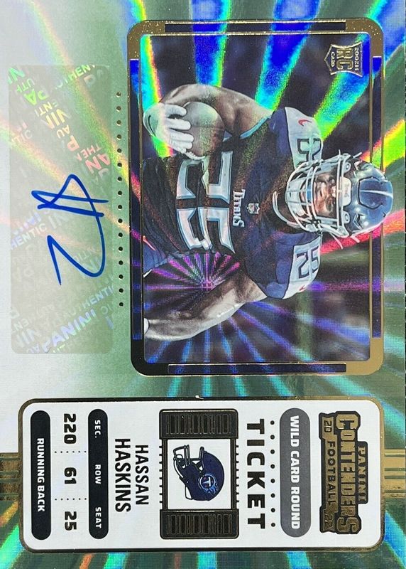 The Hassan Haskins 2022 Contenders #119 Rookie Ticket Auto - Wild Card card in Raw condition has not changed in price in the last 30 days and was last sold for $3.25 .