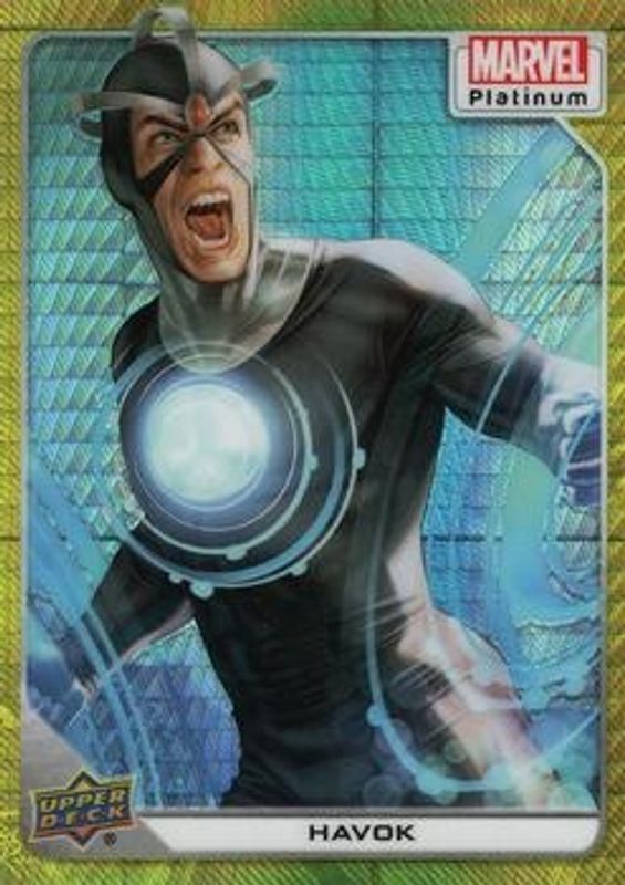 The Havok 2023 Upper Deck Marvel Platinum #72 Yellow Spotlight /399 card is 1 of 71 Havok's card variations in the 2023 Upper Deck Marvel Platinum set being tracked by Sports Card Investor, including #194 Base, #72 Base, #194 Black Rainbow, #72 Black Rainbow, and #194 Blue Rainbow.