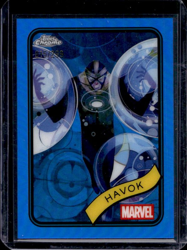 The Havok 2025 Topps Chrome #19 Blue Refractor /299 card is 1 of 29 Havok's card variations in the 2025 Topps Chrome set being tracked by Sports Card Investor, including Base, Refractor, Yellow Lava Refractor, Spider Web Refractor /399, and Blue & Green Shimmer Refractor /199.