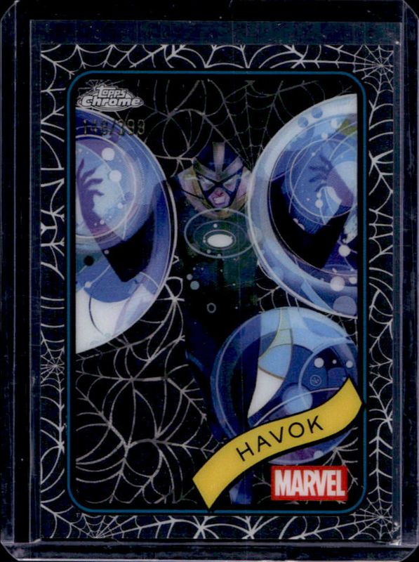 The Havok 2025 Topps Chrome #19 Spider Web Refractor /399 card is 1 of 29 Havok's card variations in the 2025 Topps Chrome set being tracked by Sports Card Investor, including Base, Refractor, Yellow Lava Refractor, Blue Refractor /299, and Blue & Green Shimmer Refractor /199.