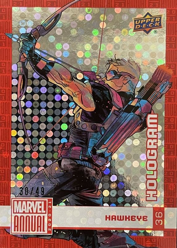 The Hawkeye 2020 Annual #36 Foilboard Hologram /49 card in Raw condition has not changed in price in the last 30 days and was last sold for $49.00 .