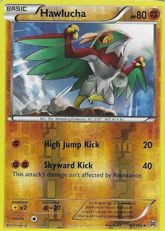 The Hawlucha 2015 XY: BREAKthrough #087/162 Reverse Holo card in Raw TCG (Lightly Played) condition has moved down -$0.30 (-10.8%) in the last 30 days and was last sold for $2.49 .