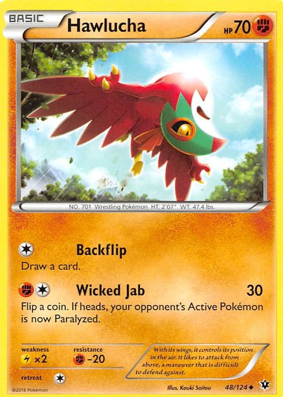 The Hawlucha 2016 XY: Fates Collide #048/124 Base card in Raw TCG (Near Mint) condition has not changed in price in the last 30 days and was last sold for $1.64 .