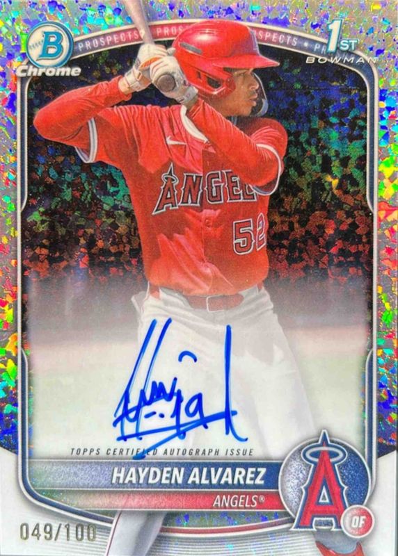 This card is 1 of 32 Hayden Alvarez's card variations in the 2025 Bowman set being tracked by Sports Card Investor, including Chrome Prospect Auto (1st), Chrome Prospect Auto - Refractor /499 (1st), Chrome Prospect Auto - Speckle Refractor /299 (1st), Chrome Prospect Auto - Purple Refractor /250 (1st), and Chrome Prospect Auto - Blue Refractor /150 (1st).