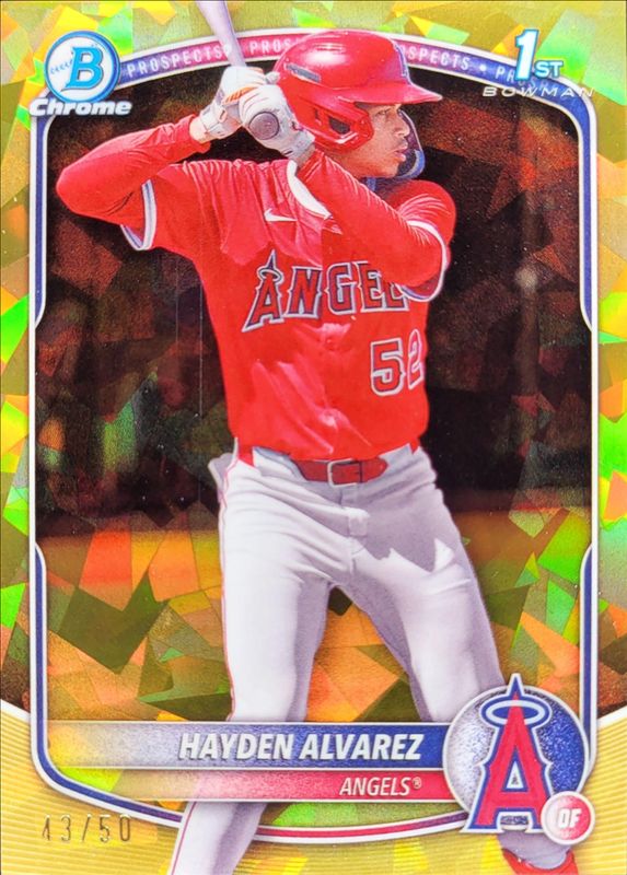 The Hayden Alvarez 2025 Bowman Sapphire Edition #BCP-12 Chrome Prospects - Gold Refractor /50 card is 1 of 9 Hayden Alvarez's card variations in the 2025 Bowman Sapphire Edition set being tracked by Sports Card Investor, including Chrome Prospects, Chrome Prospects - Green Refractor /99, Chrome Prospects - Yellow Refractor /75, Chrome Prospects - Orange Refractor /25, and Chrome Prospects - Black Refractor /10.