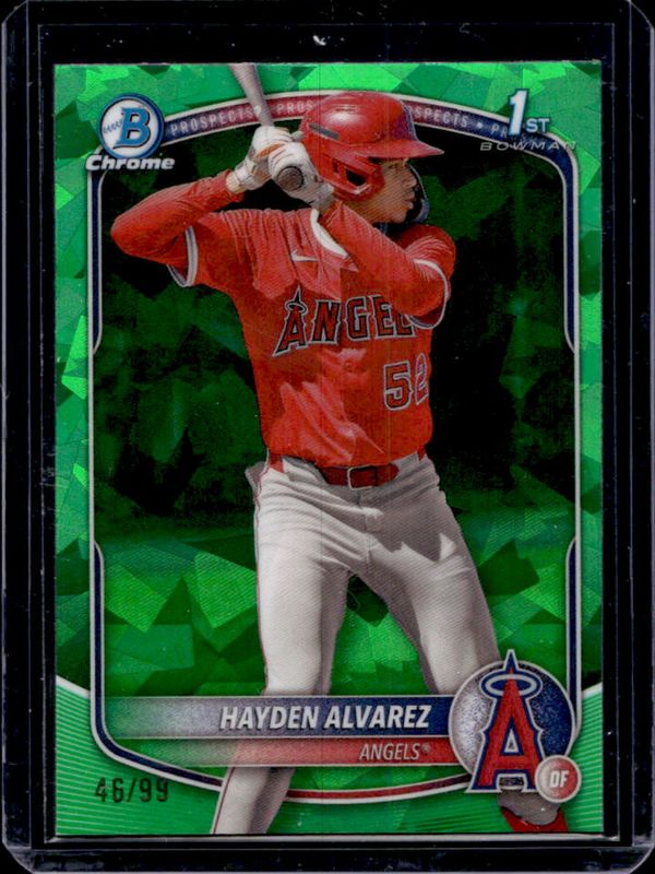 The Hayden Alvarez 2025 Bowman Sapphire Edition #BCP-12 Chrome Prospects - Green Refractor /99 card is 1 of 9 Hayden Alvarez's card variations in the 2025 Bowman Sapphire Edition set being tracked by Sports Card Investor, including Chrome Prospects, Chrome Prospects - Yellow Refractor /75, Chrome Prospects - Gold Refractor /50, Chrome Prospects - Orange Refractor /25, and Chrome Prospects - Black Refractor /10.