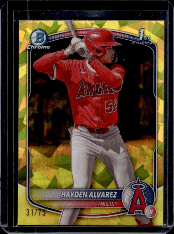 The Hayden Alvarez 2025 Bowman Sapphire Edition #BCP-12 Chrome Prospects - Yellow Refractor /75 card is 1 of 9 Hayden Alvarez's card variations in the 2025 Bowman Sapphire Edition set being tracked by Sports Card Investor, including Chrome Prospects, Chrome Prospects - Green Refractor /99, Chrome Prospects - Gold Refractor /50, Chrome Prospects - Orange Refractor /25, and Chrome Prospects - Black Refractor /10.