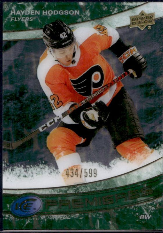 The Hayden Hodgson 2022 Upper Deck Ice #208 Ice Premieres Green /599 Rookie card is 1 of 6 Hayden Hodgson's card variations in the 2022 Upper Deck Ice set being tracked by Sports Card Investor, including Base /1299, Ice Premieres Blue /399, Ice Premieres Red /299, Ice Premieres Gold /99, and Ice Premieres Black /1.