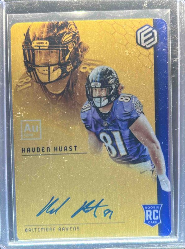 The Hayden Hurst 2018 Elements #79 Gold /50 Rookie card is 1 of 12 Hayden Hurst's card variations in the 2018 Elements set being tracked by Sports Card Investor, including Base /75, Platinum /1, Radioactive Rookie Materials /125, Xenon Rookie Jumbo Materials /125, and Radioactive Rookie Materials - Gold /99.