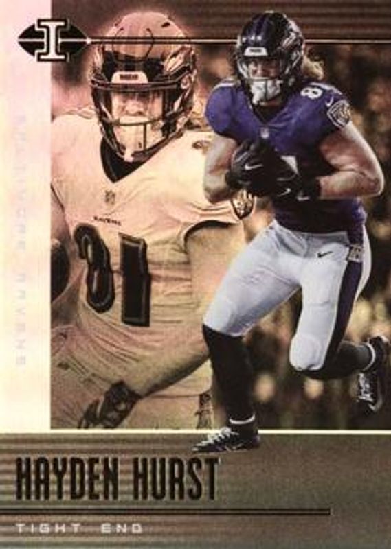 The Hayden Hurst 2019 Illusions #10 Base card is 1 of 12 Hayden Hurst's card variations in the 2019 Illusions set being tracked by Sports Card Investor, including Retail, Trophy Collection Emerald, Trophy Collection Orange, Trophy Collection Sapphire, and Trophy Collection Gold /399.