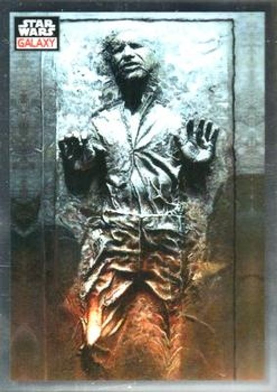 The He's All Yours, Bounty Hunter 2023 Topps Chrome Star Wars Galaxy #73 Base card is 1 of 11 He's All Yours, Bounty Hunter's card variations in the 2023 Topps Chrome Star Wars Galaxy set being tracked by Sports Card Investor, including Refractor, Aqua Refractor /199, Atomic Refractor /150, Wave Refractor /99, and Prism Refractor /75.
