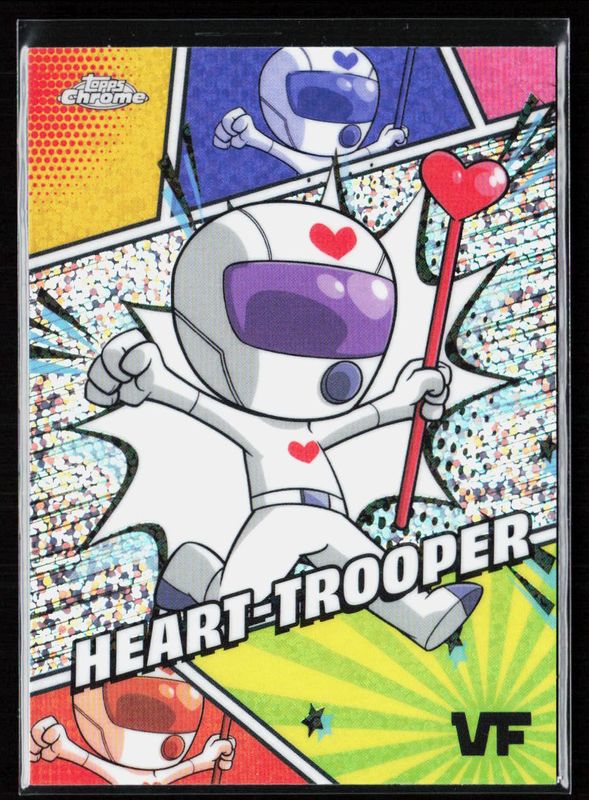 The Heart Trooper 2025 Topps Chrome VeeFriends #MSS-8 Manga Speckle card is 1 of 27 Heart Trooper's card variations in the 2025 Topps Chrome VeeFriends set being tracked by Sports Card Investor, including Base, Refractor, Yellow Refractor, Shimmer Refractor /250, and RayWave Refractor /199.