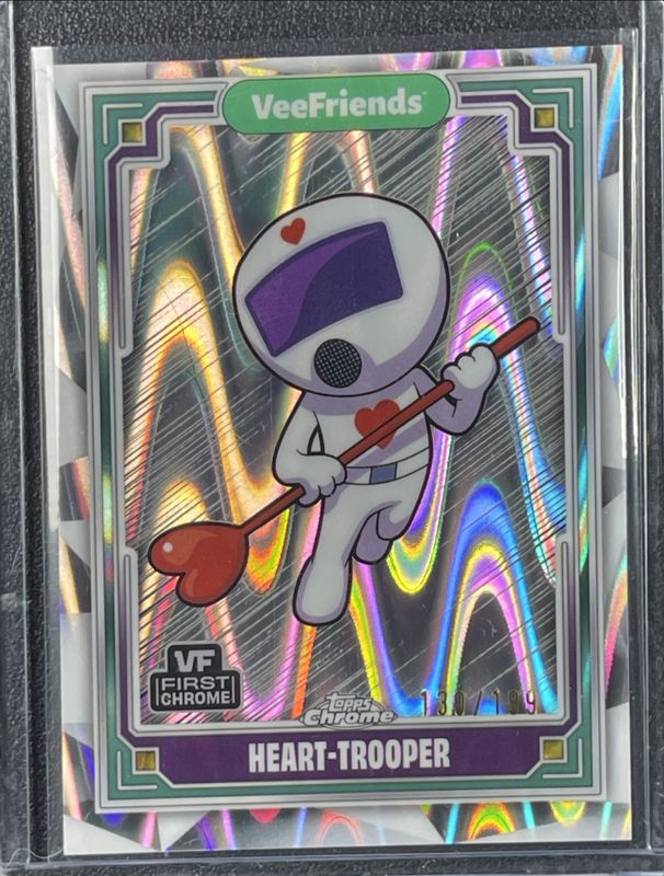 The Heart Trooper 2025 Topps Chrome VeeFriends #8 RayWave Refractor /199 card is 1 of 27 Heart Trooper's card variations in the 2025 Topps Chrome VeeFriends set being tracked by Sports Card Investor, including Base, Refractor, Yellow Refractor, Shimmer Refractor /250, and Wave Refractor /150.