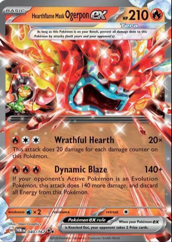The Hearthflame Mask Ogerpon ex 2024 Scarlet & Violet: Twilight Masquerade #040/167 Double Rare card in Raw TCG (Near Mint) condition has moved up $1.50 (+101%) in the last 30 days and was last sold for $2.99 .