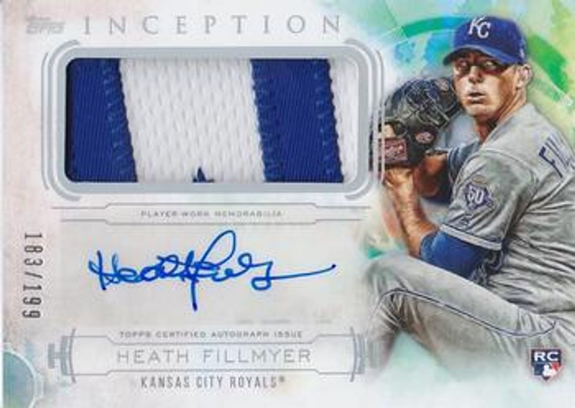 The Heath Fillmyer 2019 Topps Inception #IAP-HF Autographs Patch /199 Rookie card is 1 of 24 Heath Fillmyer's card variations in the 2019 Topps Inception set being tracked by Sports Card Investor, including Base, Green, Purple /150, Magenta /99, and Red /75.