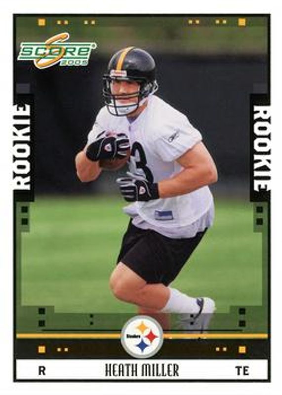 The Heath Miller 2005 Score #356 Glossy Rookie card is 1 of 6 Heath Miller's card variations in the 2005 Score set being tracked by Sports Card Investor, including Base, Scorecard /599, Adrenaline /399, Revolution /199, and Final Score /17.