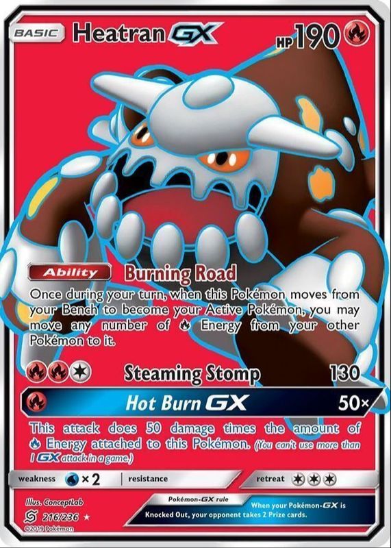 The Heatran GX 2019 Sun & Moon: Unified Minds #216/236 Holo (Full Art) card in Raw TCG (Near Mint) condition has moved down -$2.10 (-31.8%) in the last 30 days and was last sold for $4.50 .