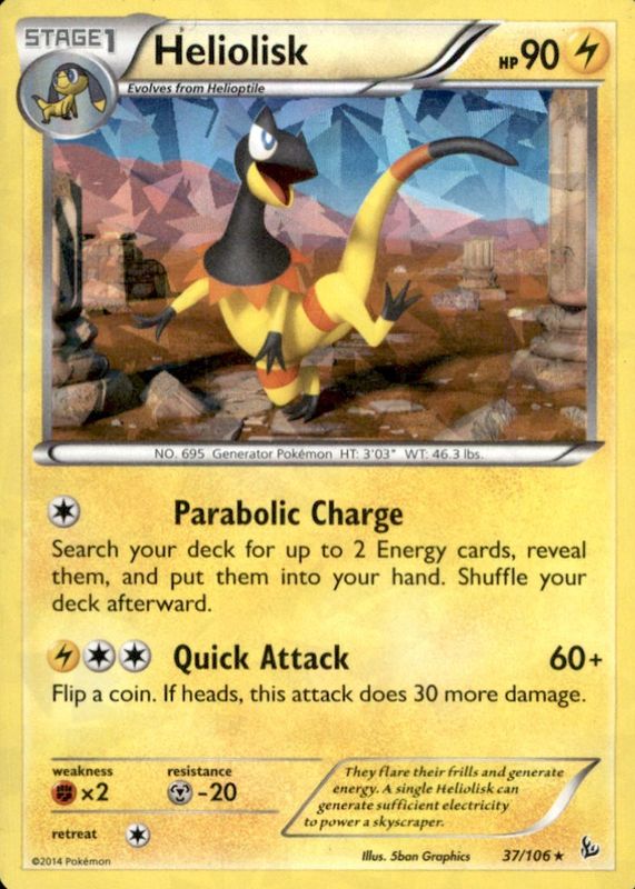 The Heliolisk 2014 XY: Flashfire #037/106 Base card in Raw TCG (Near Mint) condition has not changed in price in the last 30 days and was last sold for $1.29 .