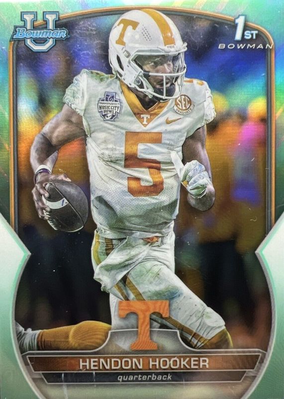 The Hendon Hooker 2022 Bowman Chrome University #21 Prospects - Aqua Wave Refractor /299 (1st) card in Raw condition has not changed in price in the last 30 days and was last sold for $25.00 .