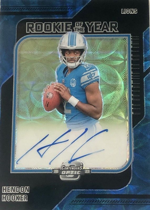 The Hendon Hooker 2023 Contenders Optic #ROY-HH Rookie of the Year Contenders Autographs - Black Scope /25 card in Raw condition has not changed in price in the last 30 days and was last sold for $99.00 .