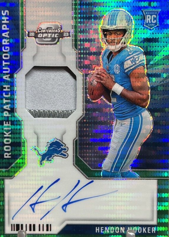 The Hendon Hooker 2023 Contenders Optic #RPA-HH Rookie Patch Auto - Green Pulsar /15 card in Raw condition has not changed in price in the last 30 days and was last sold for $100.00 .