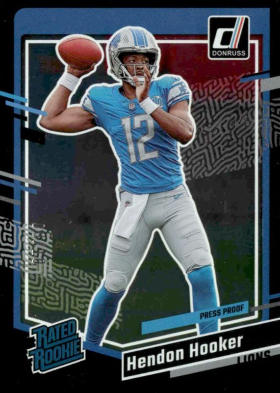 The Hendon Hooker 2023 Donruss #329 Press Proof Black /10 Rookie card in Raw condition has not changed in price in the last 30 days and was last sold for $11.50 .